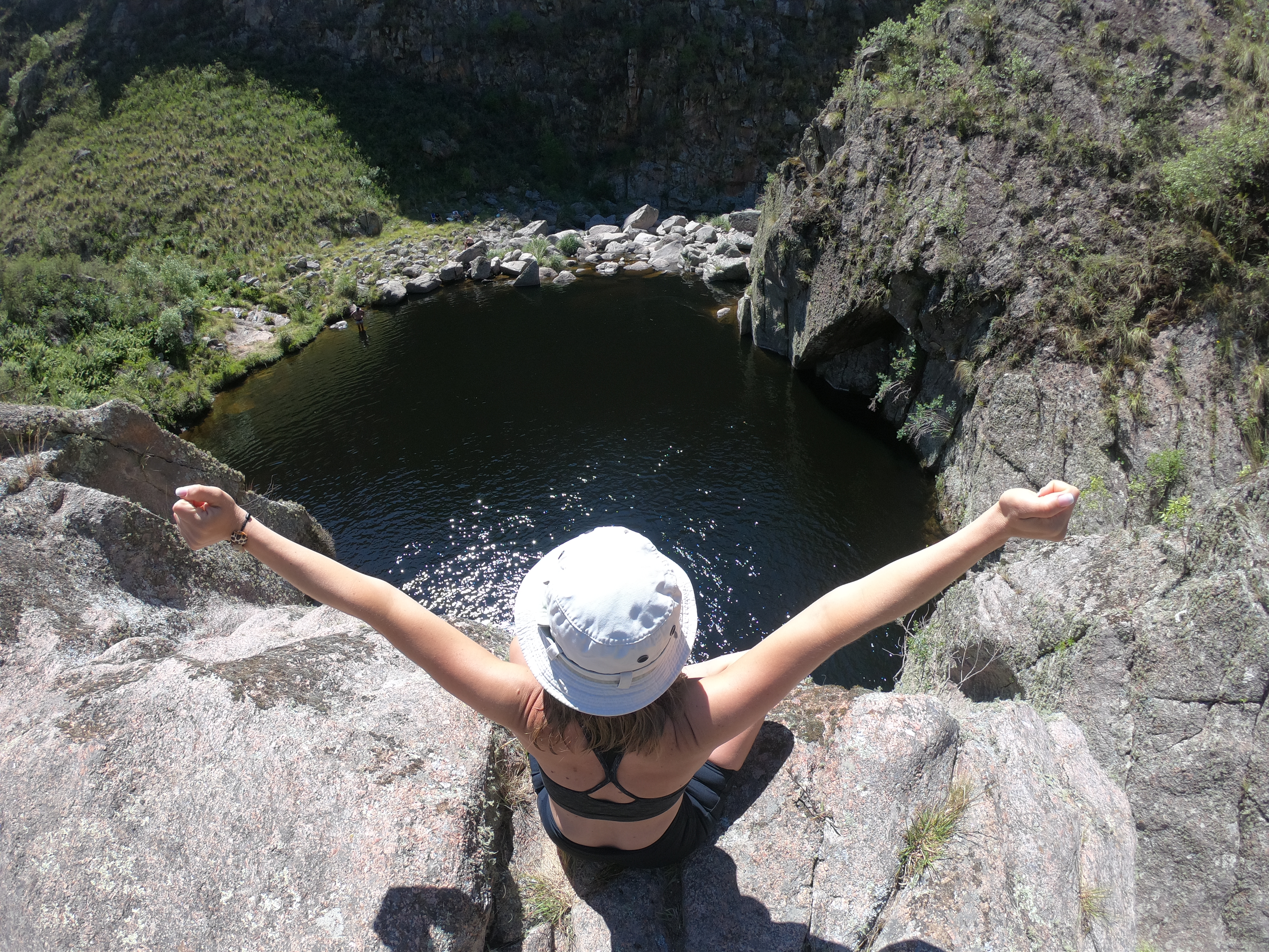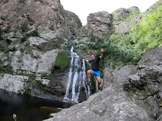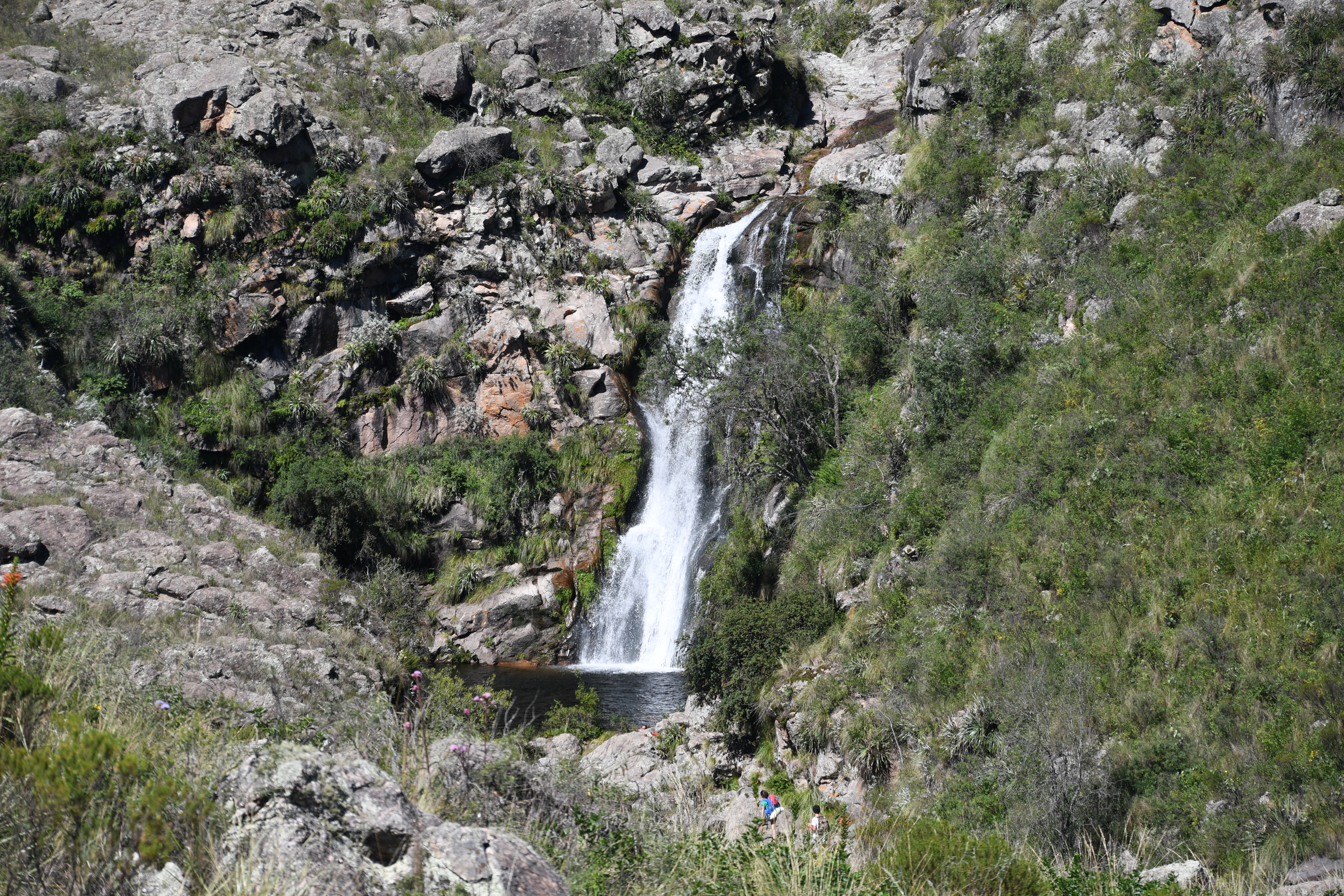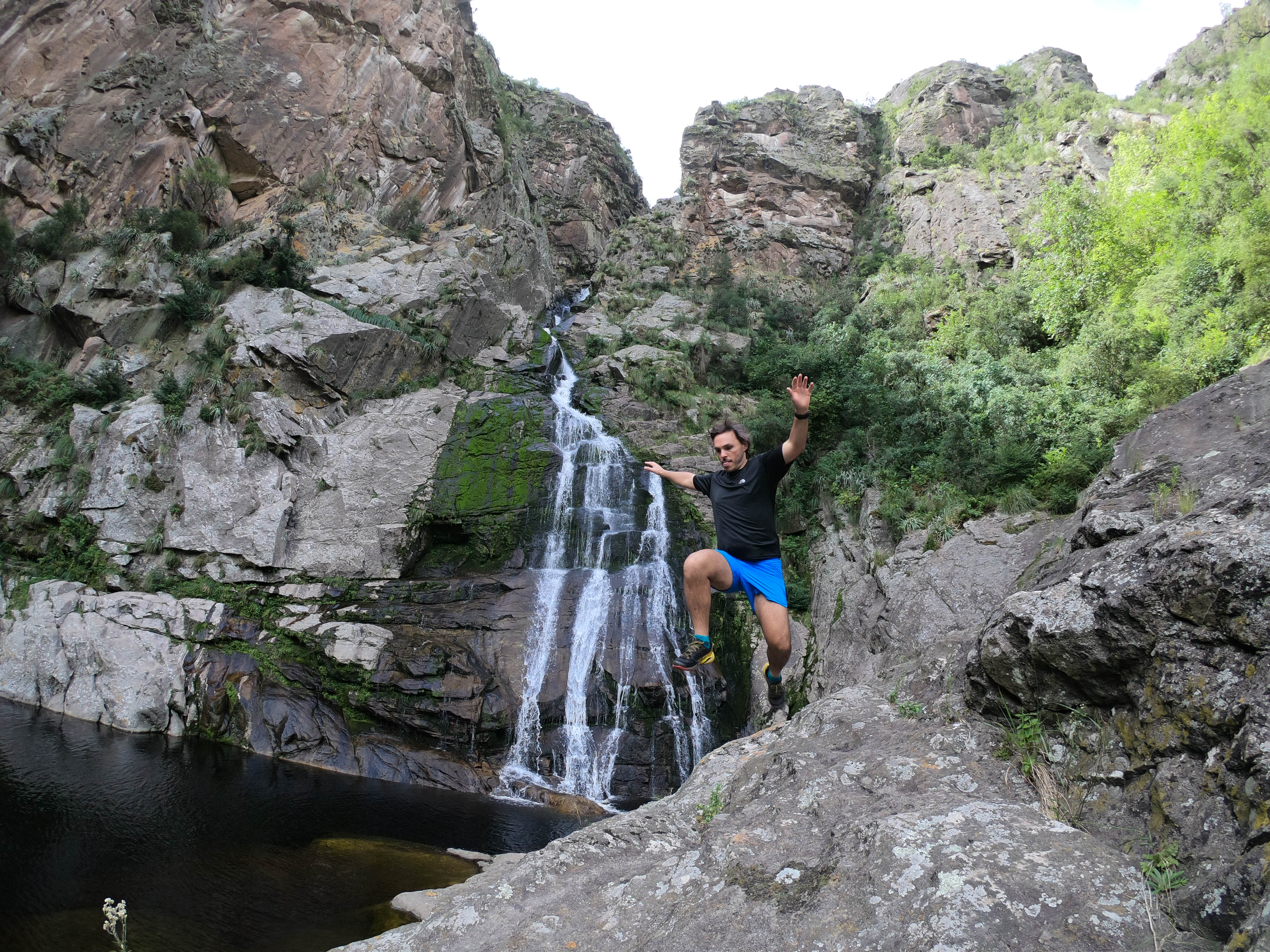 Siguiendo el recorrido, 2 curvas más allá del parador Fundación Condor tenemos que dejar el vehículo para continuar a pié. Allí parados podemos divisar el río abajo. Una tranquera (que hay que pasar) marca el inicio del recorrido de 2 kms desde la ruta. No existe ningún sendero marcado. Apenas hay rastros de lo que alguna vez estuvo demarcado, hoy cubierto por yuyos altos lo que lo hace un poco dificultoso para quienes tengan algún problema de movilidad. De todas maneras, es imposible perderse por las referencias bien claras de la ruta hacia arriba y del río hacia abajo. Por allí y unos 75 kilómetros de la ciudad se llega a la espectacular Cascada del Carnero, que además nos regala una hoya cristalina y tentadora.