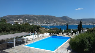 El Hotel Akrotiri está sobre una colina enfrentando al puerto de Parikia. La ciudad de Paros a donde llega el ferry desde Santorini. El hotel es muy limpio y prolijo, la atención personalizada y realmente esmerada, el desayuno buffet es completo y un placer tomarlo en la galería al aire libre a la sombra de las enredaderas. Al estar en la montaña, las vistas son fabulosas y las habitaciones espaciosas. El baño de nuestra habitación era moderno.pero quizás un poco pequeño aunque eso no fue problema. Esta algo alejado del centro por lo que es imprescindible tener un vehículo para poder moverse y recorrer.